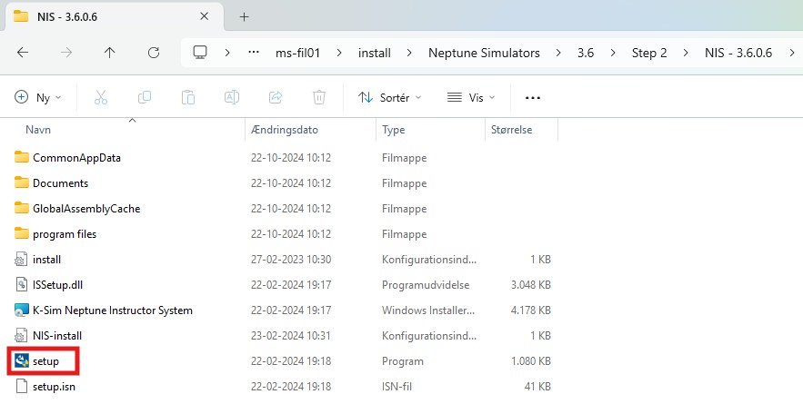 - Step 6 – Når pc’en er startet op igen og du kan gå ind på fællesdrevet igen går du ind og installerer filen i “Step 2” som er “Neptune Instructor System”. Det er det program som sørger for din pc kan trække en licens til simulatoren således du har mulighed for at bruge simulations programmet. Du skal blot køre den fil der hedder “Setup” og så kører du bare installationen igennem.