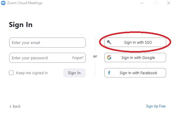 - Step 1 – Du skal åbne zoom klienten ved at trykke på Windows tasten og så finde den under programmer som Windows bruger. Er du Mac bruger går du i “Launchpad” og åbner programmet derfra. Når du har åbnet programmet vælger du “Sign in with SSO” :