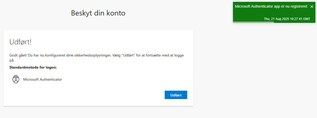 Når koden er indtastet vil du blive bedt om at sætte MFA (Multifaktor Authentication) op så du ud over adgangskoden skal indtaste en kode på din telefon – Du kan hente Microsoft Authenticator både til Android og iPhone på deres egen app store. Hvis du er i tvivl om hvordan du sætter MFA op så følg vores MFA guide her – Når din MFA er godkendt og sat op skal du følge resten her: