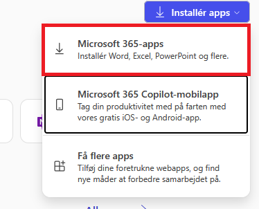 I højre side inde i menuen Apps skal du vælge “Installer apps” og så vælger du “Microsoft 365-apps” i toppen af menuen:
