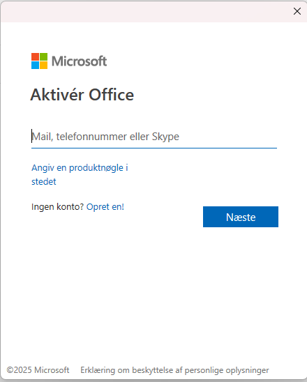 Så vil du blive bedt om at aktivere Office pakken og der skriver du din skolemail (“dit-studienummer@aams.dk”):