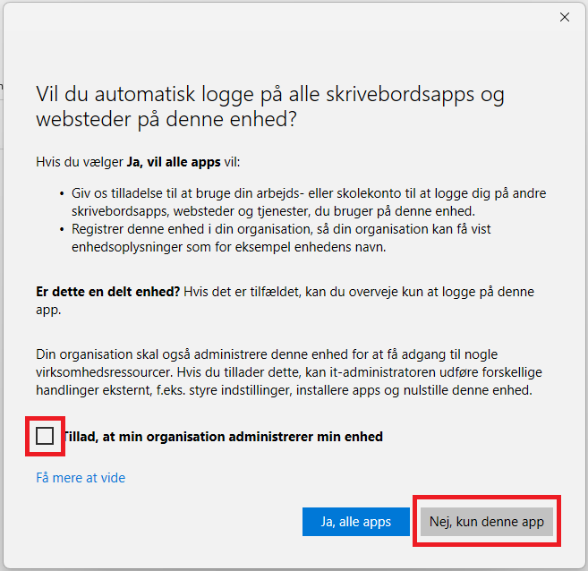Når dit login er blevet godkendt vil du blive spurgt om du vil tillade at din organisation styrer din enhed – HER ER DET MEGET VIGTIGT AT FJERNE FLUEBENET OG VÆLGE “NEJ KUN DENNE APP” – Da jeres computere ikke skal ind i vores Intune opsætning som studerende:
