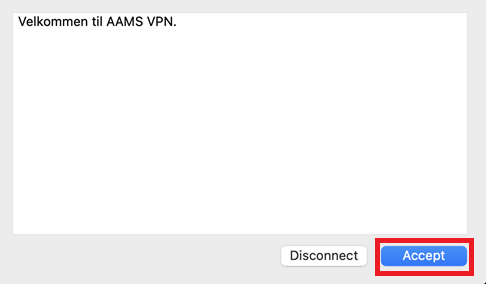 - Step 8 – Du skulle nu gerne se en banner besked der siger “Velkommen til AAMS VPN” – Her trykker du blot “Accept” for at godkende forbindelsen og så er du på VPN.
