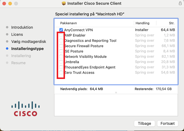 - Step 3 – Det første du skal tage stilling til under installationen af VPN er HVILKEN installationstype du vælger – Her skal du fjerne fluebene i ALT undtagen AnyConnect VPN – Sæt det op som på billedet under: