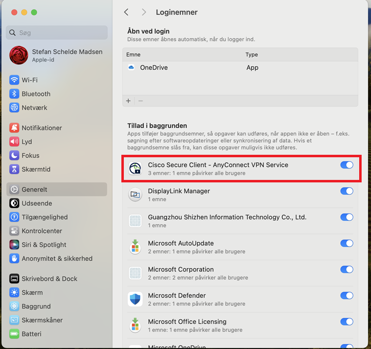 - Du vil blive bedt om at gå ind og “sætte flueben” ved Cisco Secure Client – Anyconnect VPN Service i loginemner: