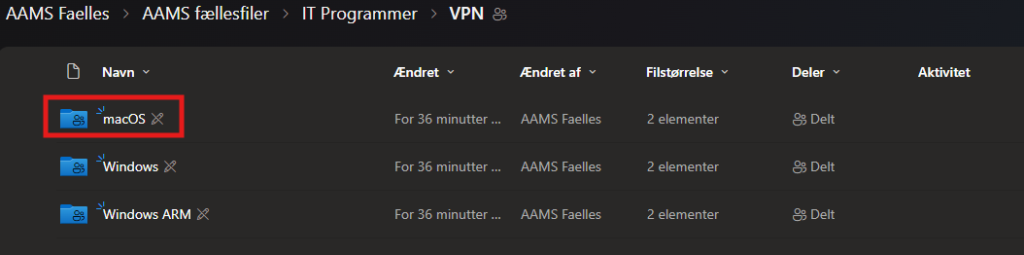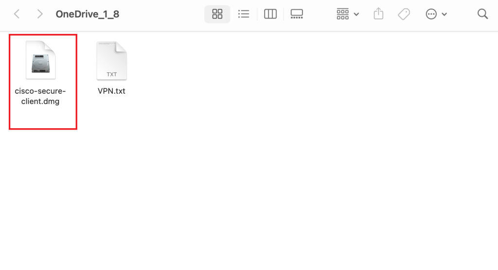 - Step 2 – Når filerne er hentet går du ind i mappen og kører filen “cisco-secure-client.dmg” så installationen går i gang:
