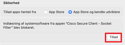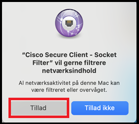 - Step 5 – Du vil også blive bedt om at tillade at Cisco installerer app’en “Cisco Secure Client – Socket Filter” så sørg for at vælge “Tillad” og “Tillad”:
