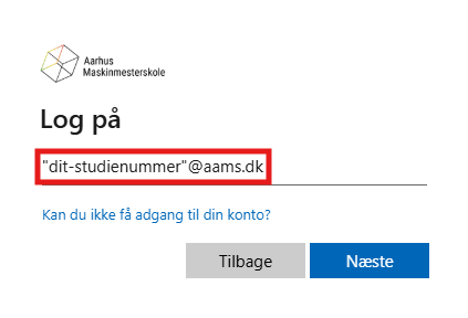 - Step 2 – Når du prøver at logge ind skal du huske at logge på med din skolemail – Det vil sige “dit-studienummer@aams.dk” samt den kode du bruger på campus.