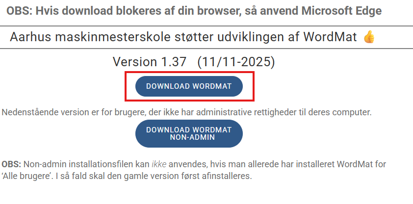 Som der også er beskrevet så skal du være på en af skolens lokationer for at kunne hente denne udgave af Wordmat. Til de af jer som går på MFU der vil det være muligt at hente den ved at gå på VPN og så tilgå linket derhjemme fra.